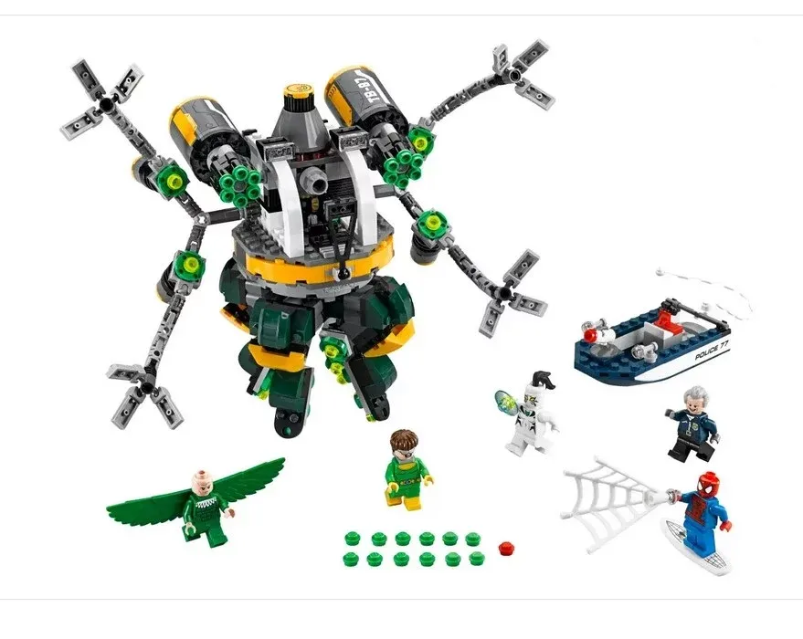 L’Octo-Bot comprend 6 doubles fusils à tir rapide, un torse rotatif et des tentacules mobiles et détachables qui s’attachent au dos de Doc Ock. Il faudra repousser le Vautour avec l’élément de toile de Spider-man, puis libérer Tigre Blanc pour qu’elle puisse bondir contre Doc Ock et aider Spider-Man à vaincre les malfaiteurs.