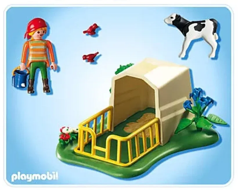 Allons nourrir le veau ! Avec une fermière, un abri et un veau. Seau avec tétine intégrée pour donner à boire au veau.