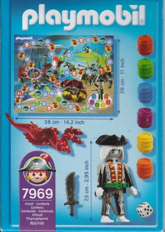 Comprend un pirate, 6 tonneaux de couleurs différentes, un serpent de mer à trois tête, un dé et un tapis de jeu.