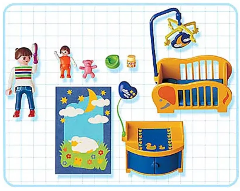 Chambre joliment équipée d’un petit lit à barreaux avec mobile à étoiles et table à langer pour bébé