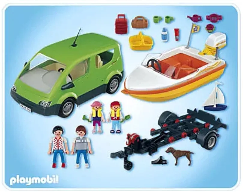 Voiture familiale avec remorque porte-bateaux ainsi qu’un bateau. 4 personnages, un chien et de nombreux accessoires pour pique-niquer. Le bateau flotte et peut accueillir le moteur submersible.